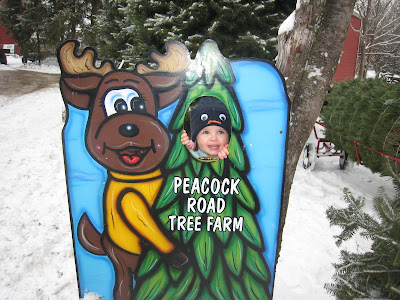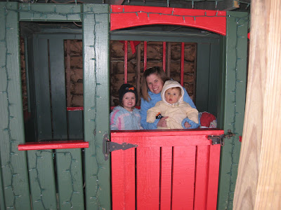 We had a great time yesterday (at the recommendation of some friends) at a local Christmas Tree farm. They have a little train that took us into the woods...all the way to the North Pole! (You know, we are pretty far north up here.) We arrived at Santa's cabin and Abby was so excited to see him! She had to wait her turn to sit on his lap. (She did a good job waiting.) When it was her turn, she was so excited that, as she ran up to him, she was saying, "I want a princess suitcase." (She came up with that one on her own and has been asking for it for several weeks now.) Briton also got his turn on Santa's lap. The picture isn't very good, but he was all smiles.