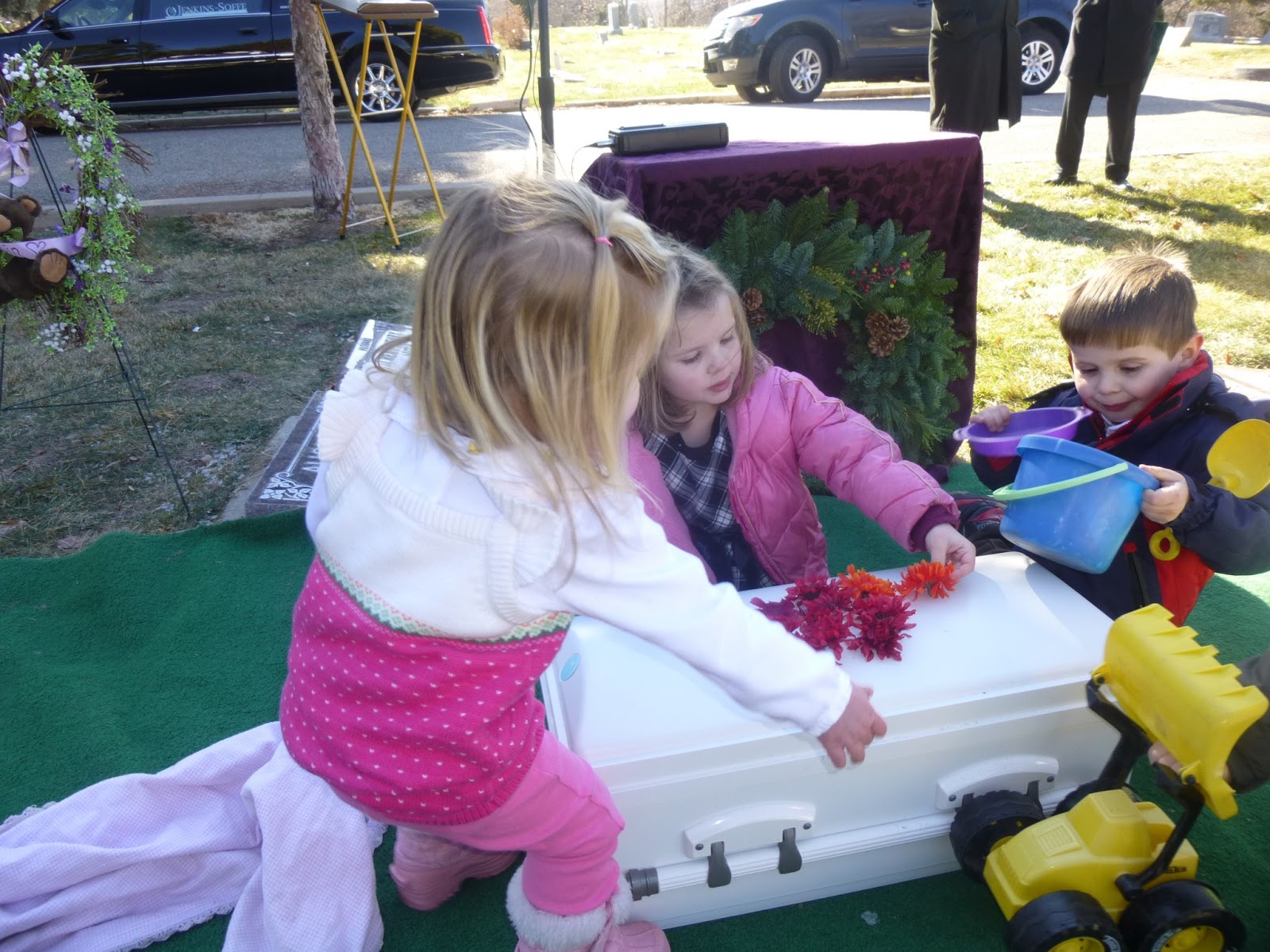 After the service the kids played around the cemetery a bit. Abby found some silk flowers (I decided not to ask her where she found them) and decorated Milli's casket with them. The kids were interested in seeing the hole she'd be buried in so the funeral directors removed the board and showed them the hole. Mike and the big kids ended up climbing down into the hole to place the casket (with the silk flowers lovingly arranged on top).